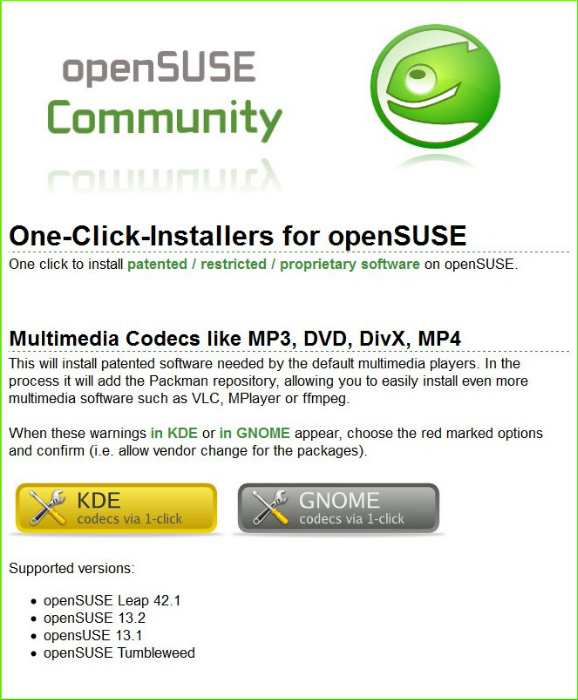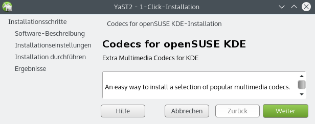 Da die codecs von Kaffeine üblicherweise fehlen, habe ich mich an die 'codecs-kde.ymp' erinnert. Auch in den vorherigen Versionen von openSUSE wurden sie von mir installiert und haben zum gewünschten Erfolg geführt. Mit dem Browser lade ich mir die codecs in meinen Downloadordner herunter.
