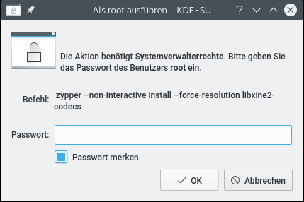 Die Warnung wegen der Arglistigkeit quittiere ich mit 'Ja'.Die Installierung erfordert Systemverwalterrechte und somit das Passwort des Benutzers 'root'.