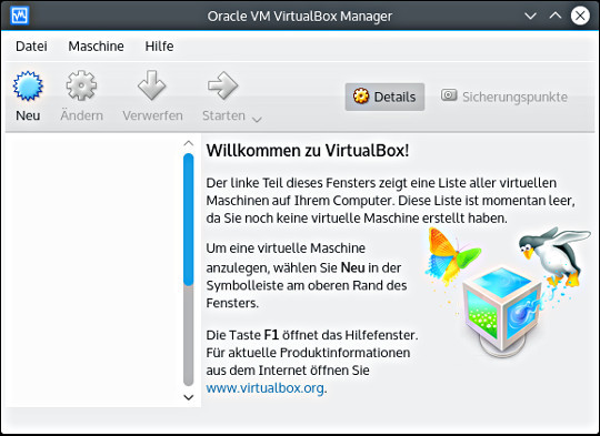 Im anderen Fall erscheint sofort das Panel mit der Überschrift 'Willkommen zu VirtualBox!'.