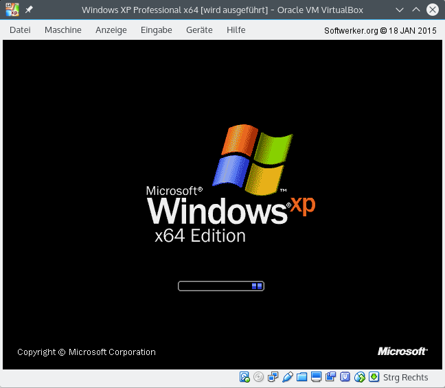 Starten von Windows XP Professional x64 Edition unter VM VirtualBox.